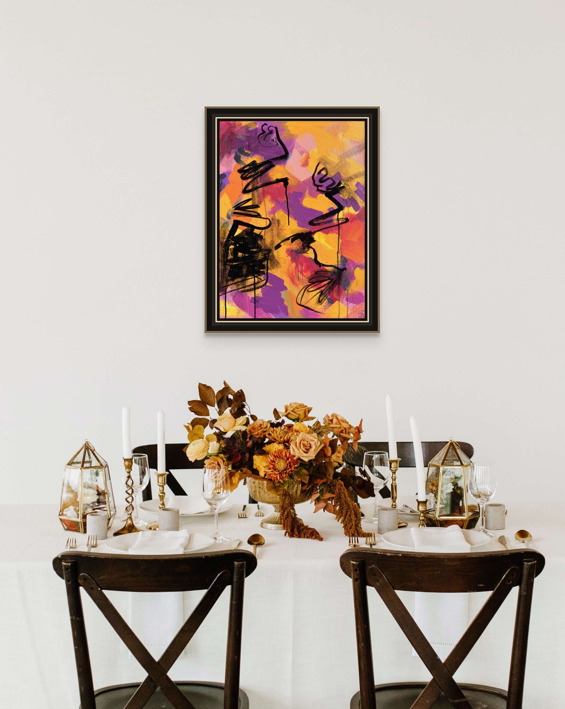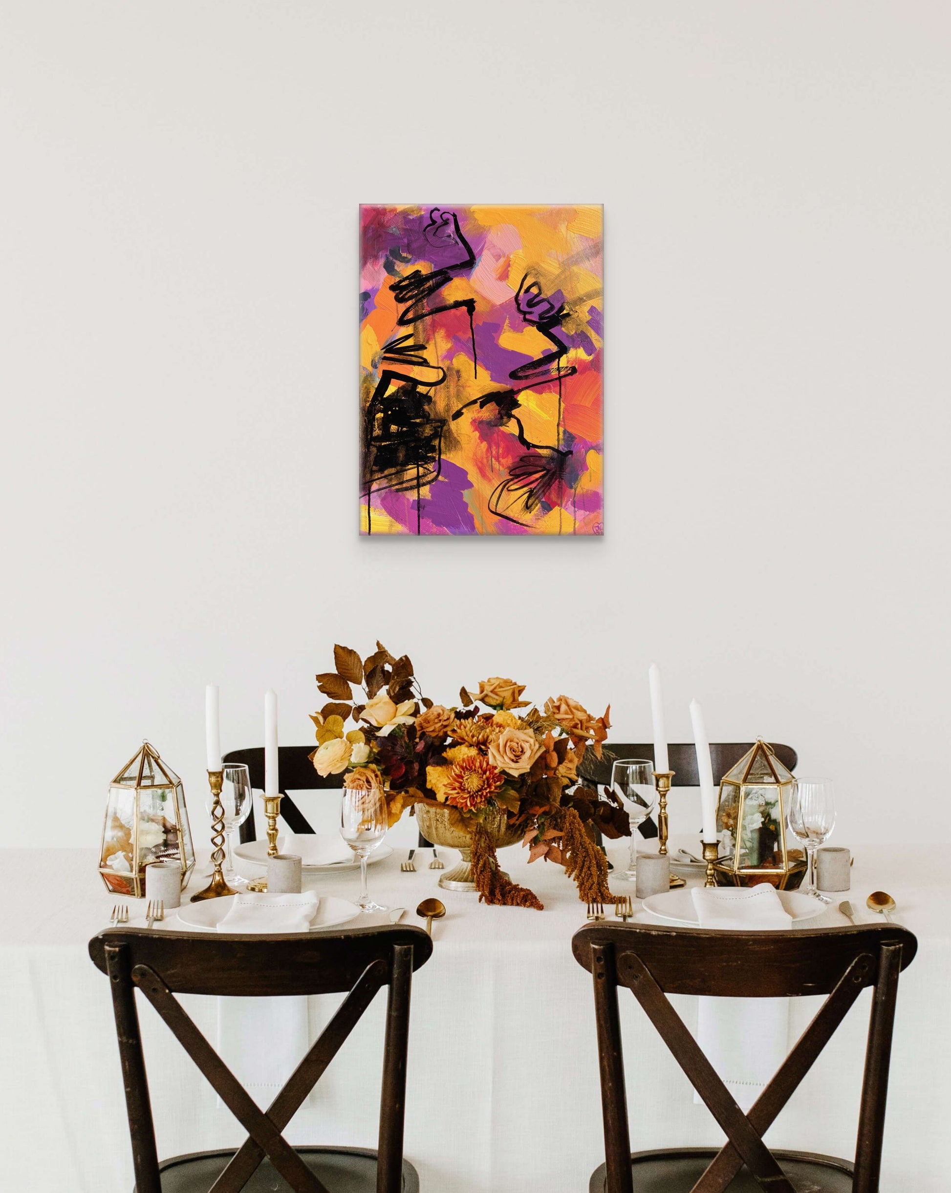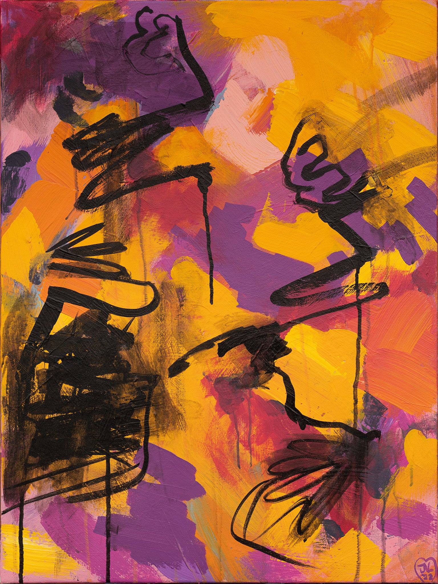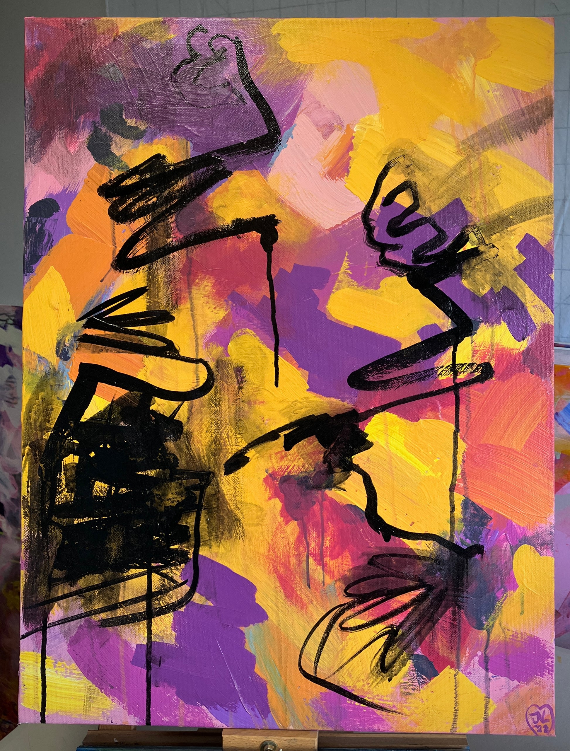 "To Give To Receive" is an 18x24" acrylic painting on canvas (1.5" canvas depth), completed in 2022. There's an exchange of energies here, an air of incense and ritual, a feeling of vitality in this piece. A balance of radiant gold and regal purple create a lively setting against which the linework can come together, to give, to receive.
